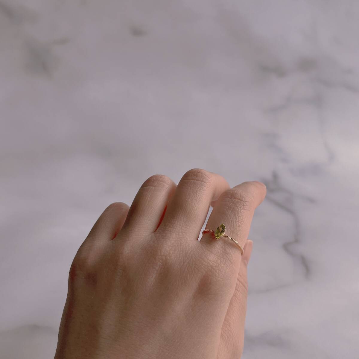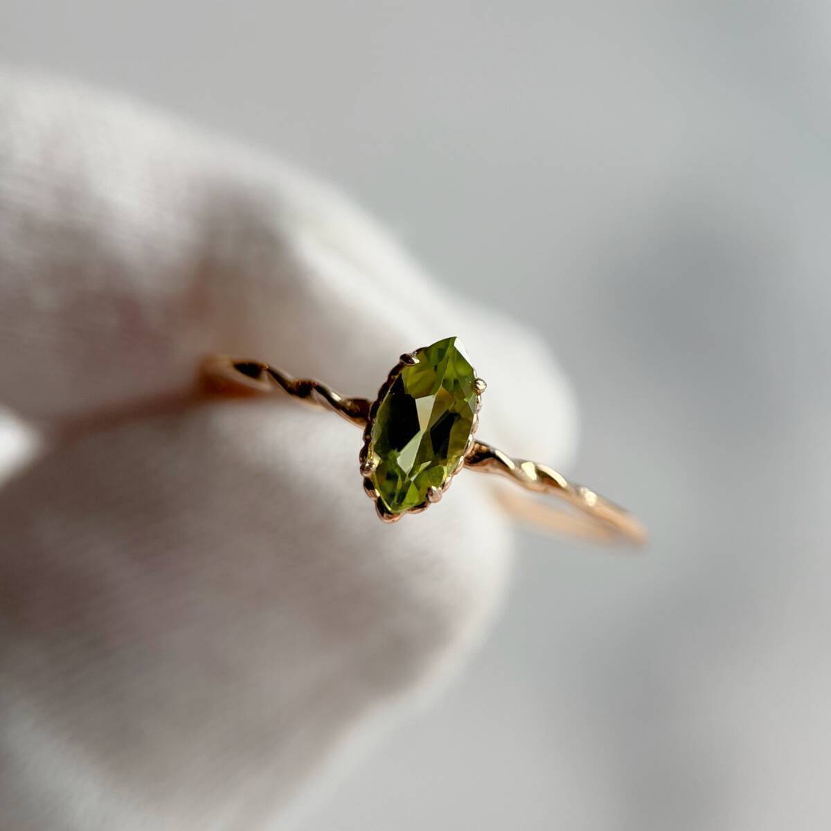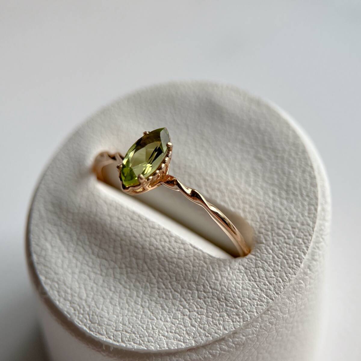 マーキスカットの天然ペリドットの一粒石リングです。