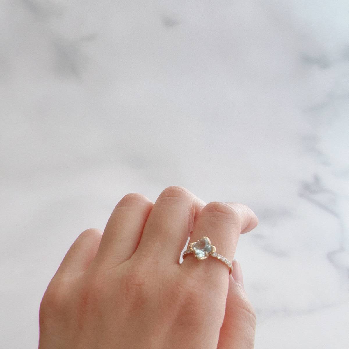 お花の形にカットされた、天然スカイブルートパーズが使われたリングです。