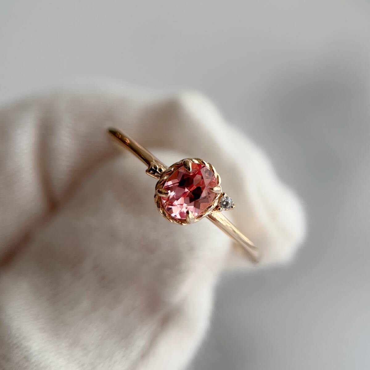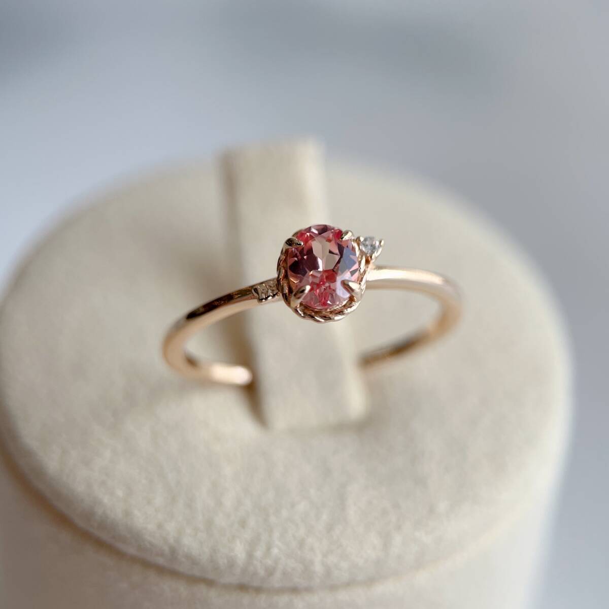 オレンジとピンクの混じり合ったような、絶妙な色味のストーン。