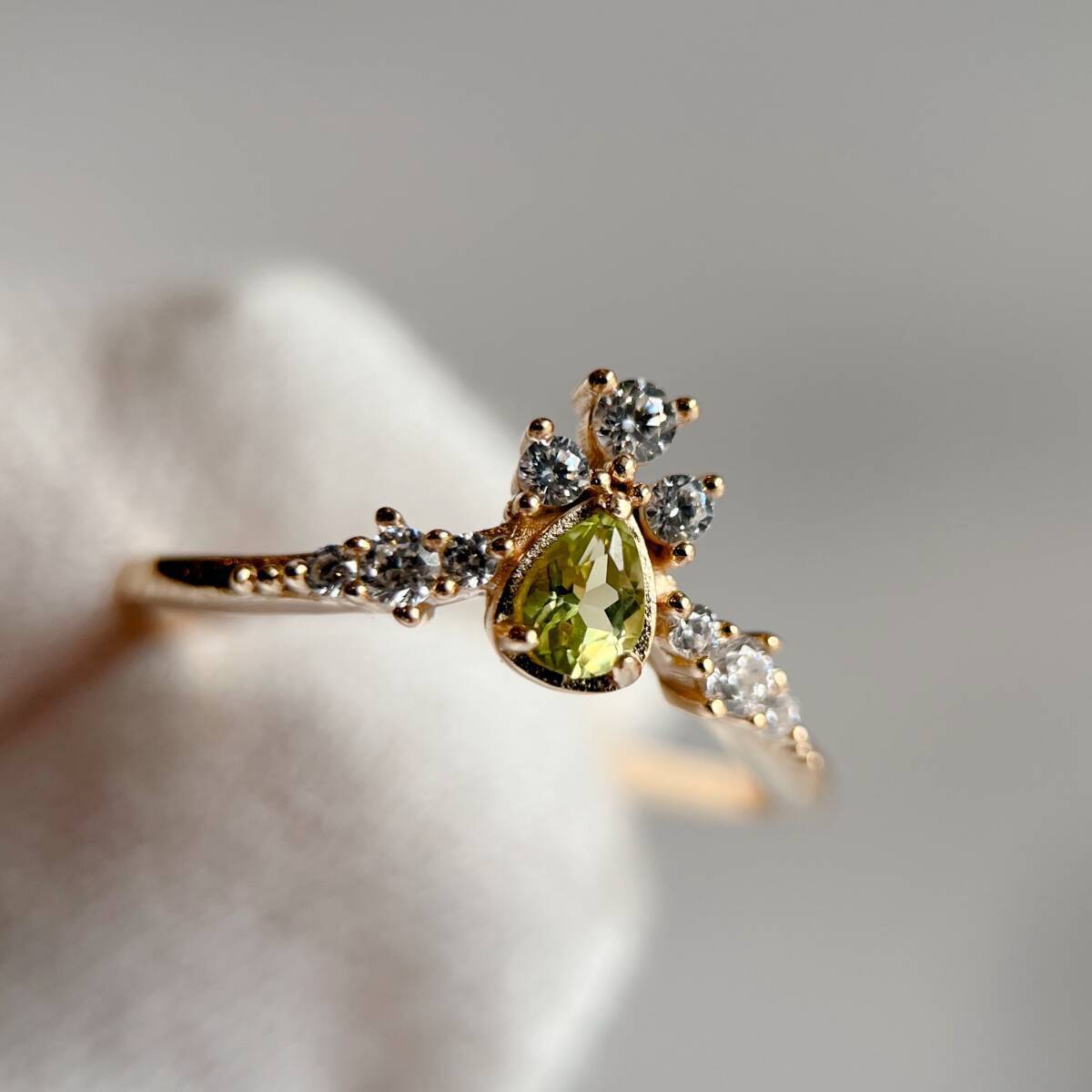 ドロップ型にカットされたの天然ペリドットを使ったリング。キュービックジルコニアに囲まれ、まるでティアラのようなデザインです。