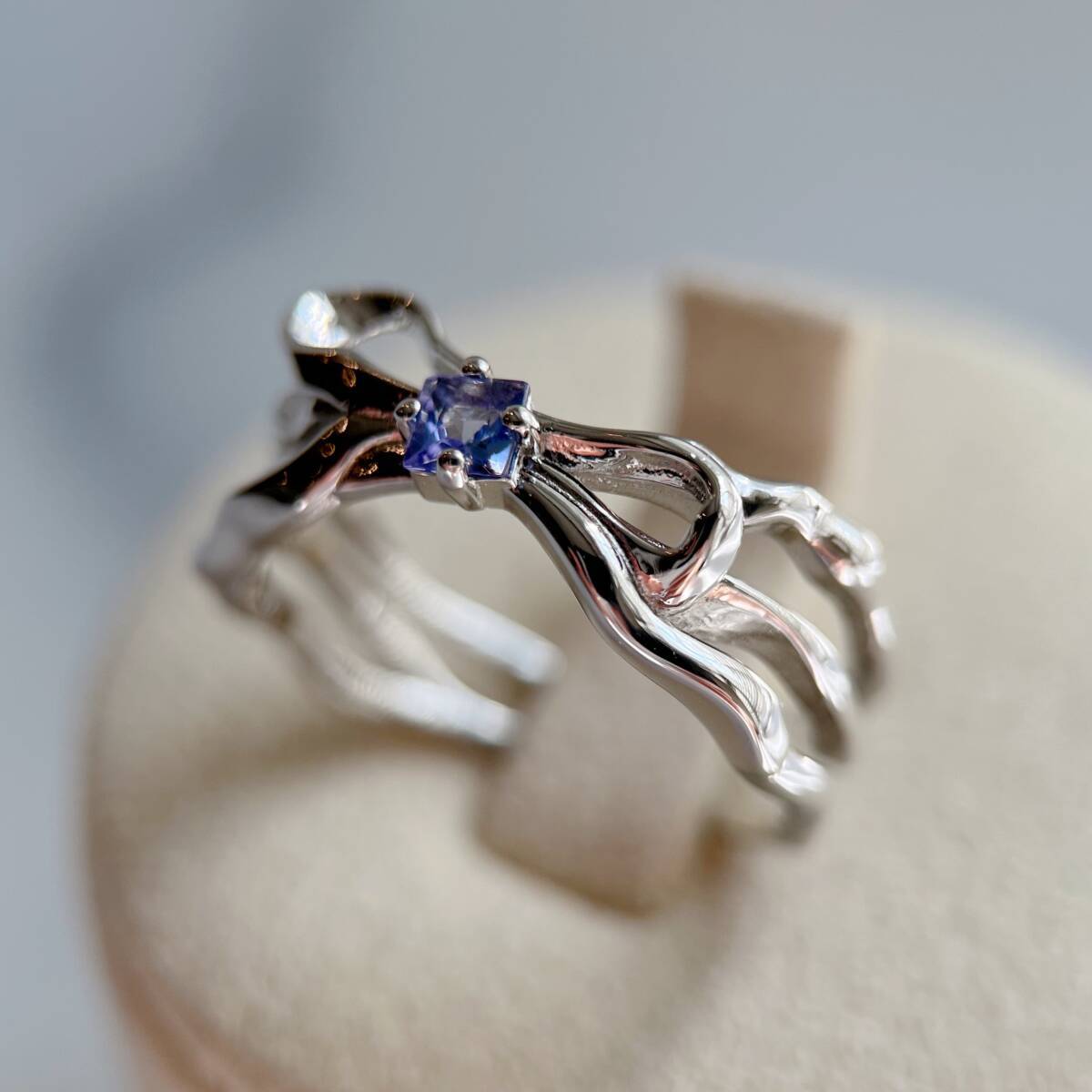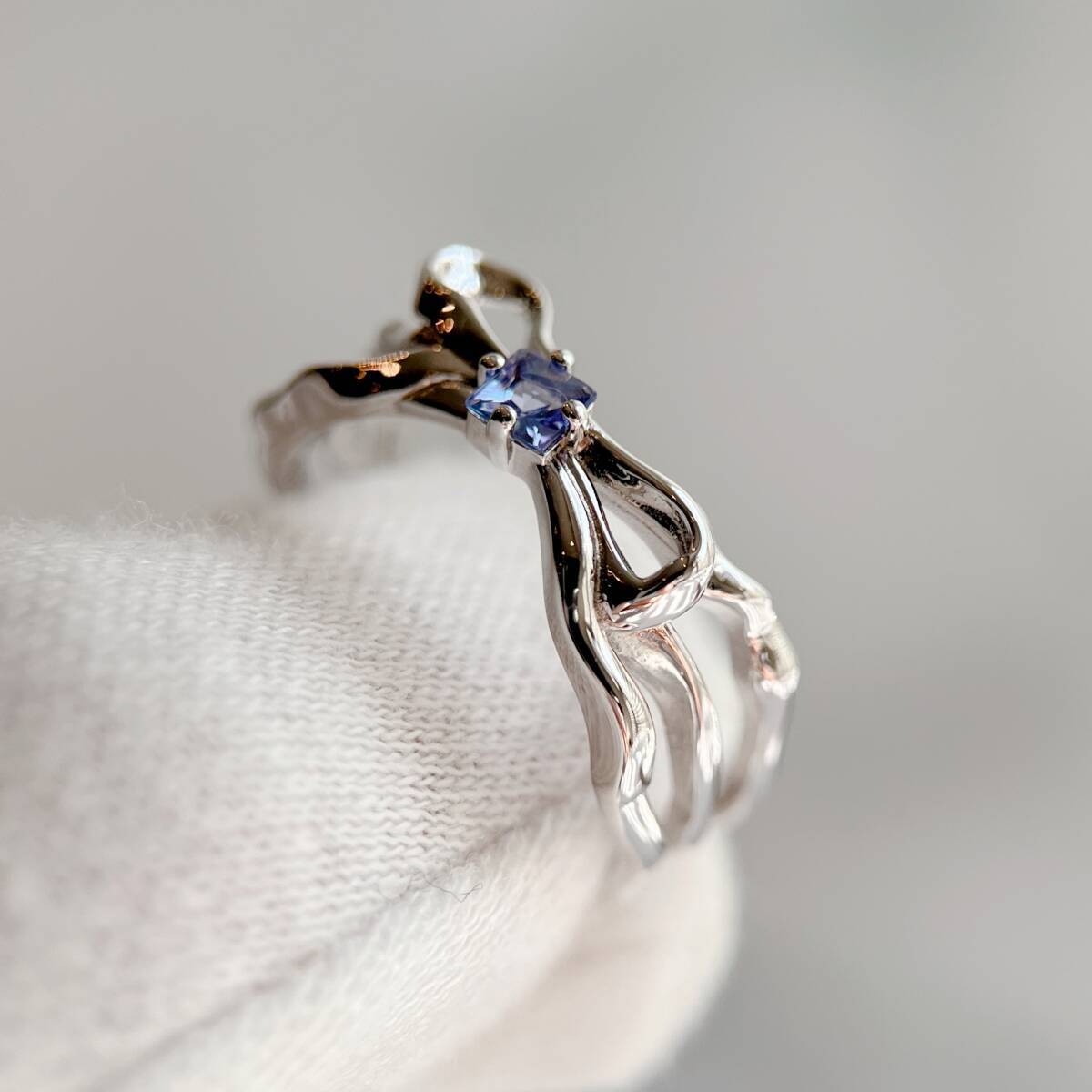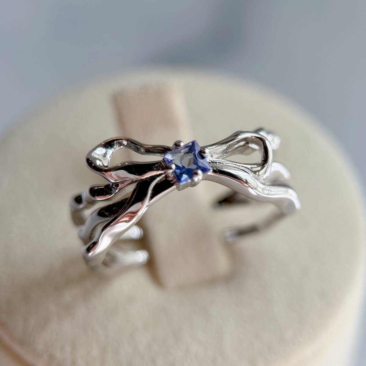 スクエア型にカットされた天然タンザナイトを、リボンのモチーフの真ん中にあしらったリング。