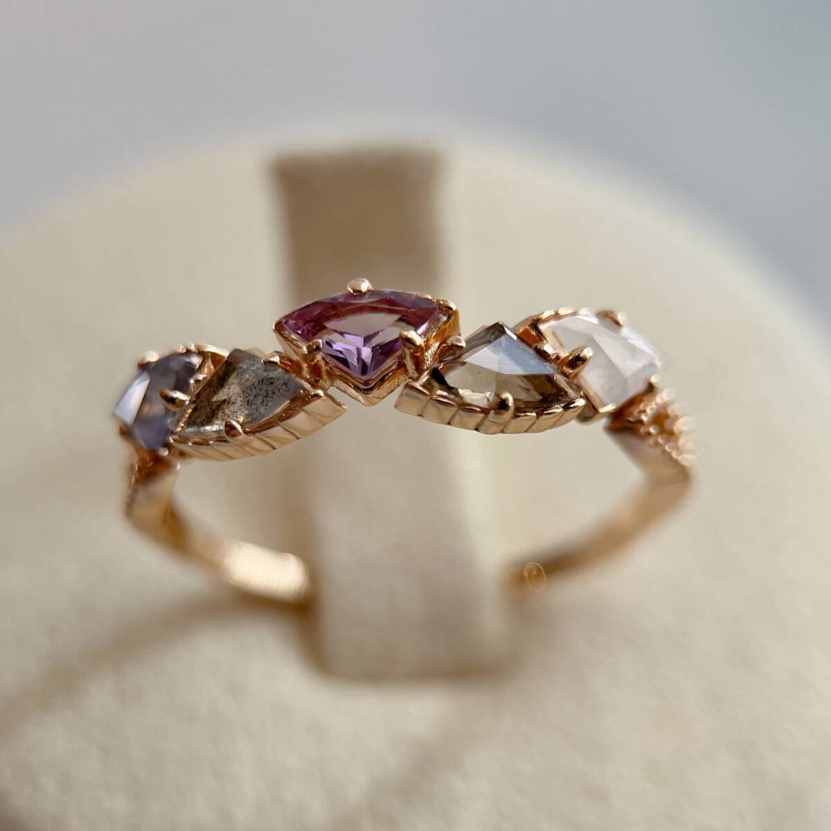 扇型にカットされた5色の天然カラーストーンがセットされたリング。