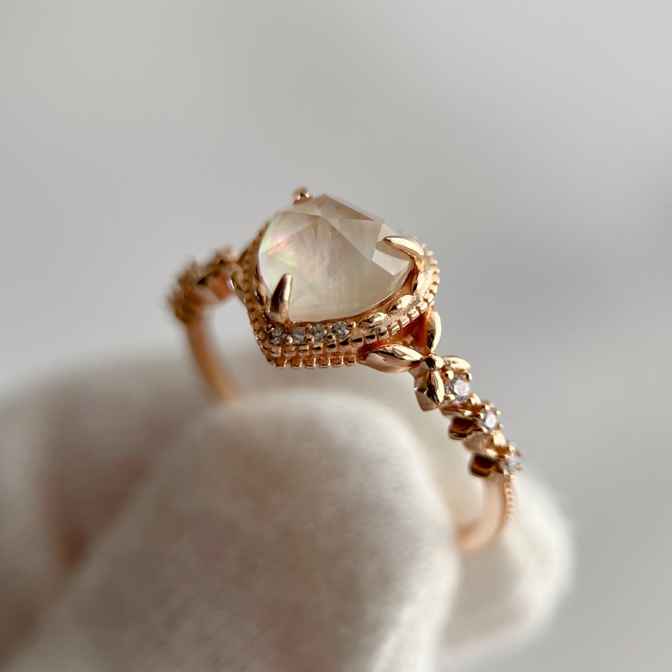 ハートにカットされ虹色に輝く大粒のストーンが可愛らしい印象。