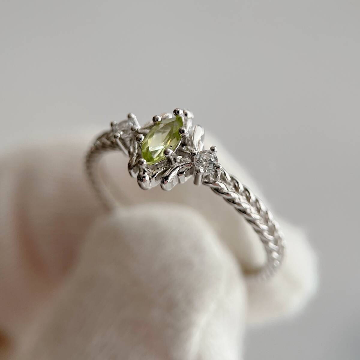 天然ペリドットマーキスカットリング ホワイトゴールド色 silver925製