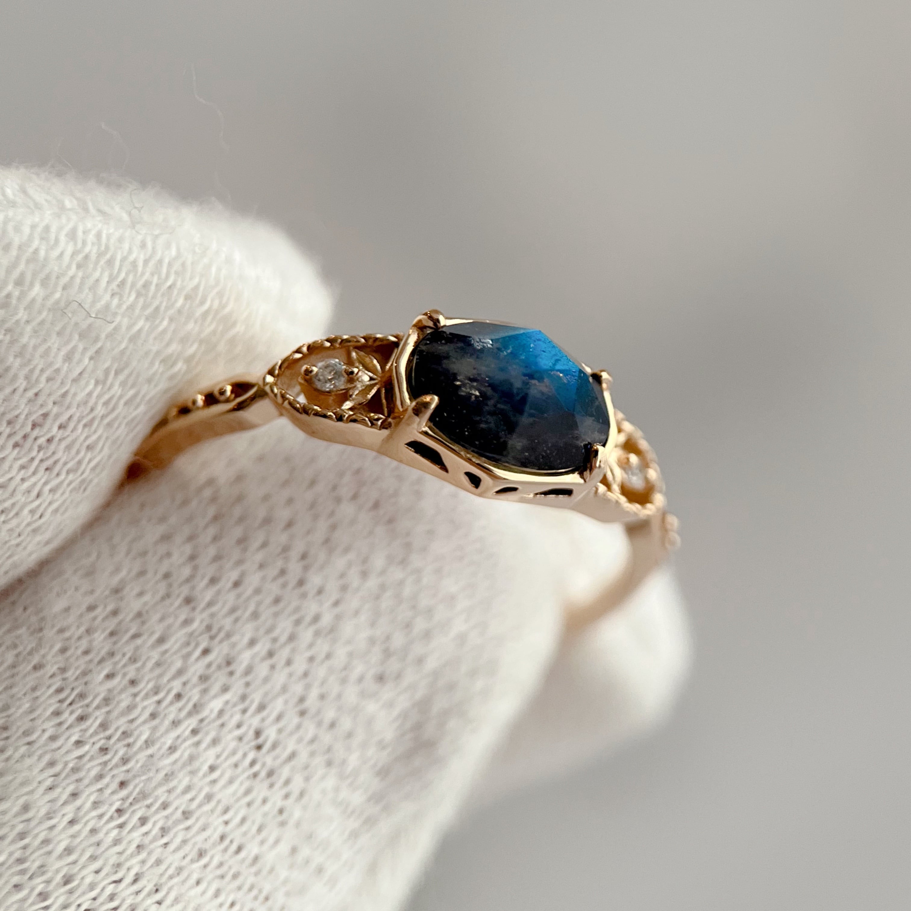 天然ブルーアベンチュリンとラブラドライトを貼り合わせたダブレットストーンのリングです。