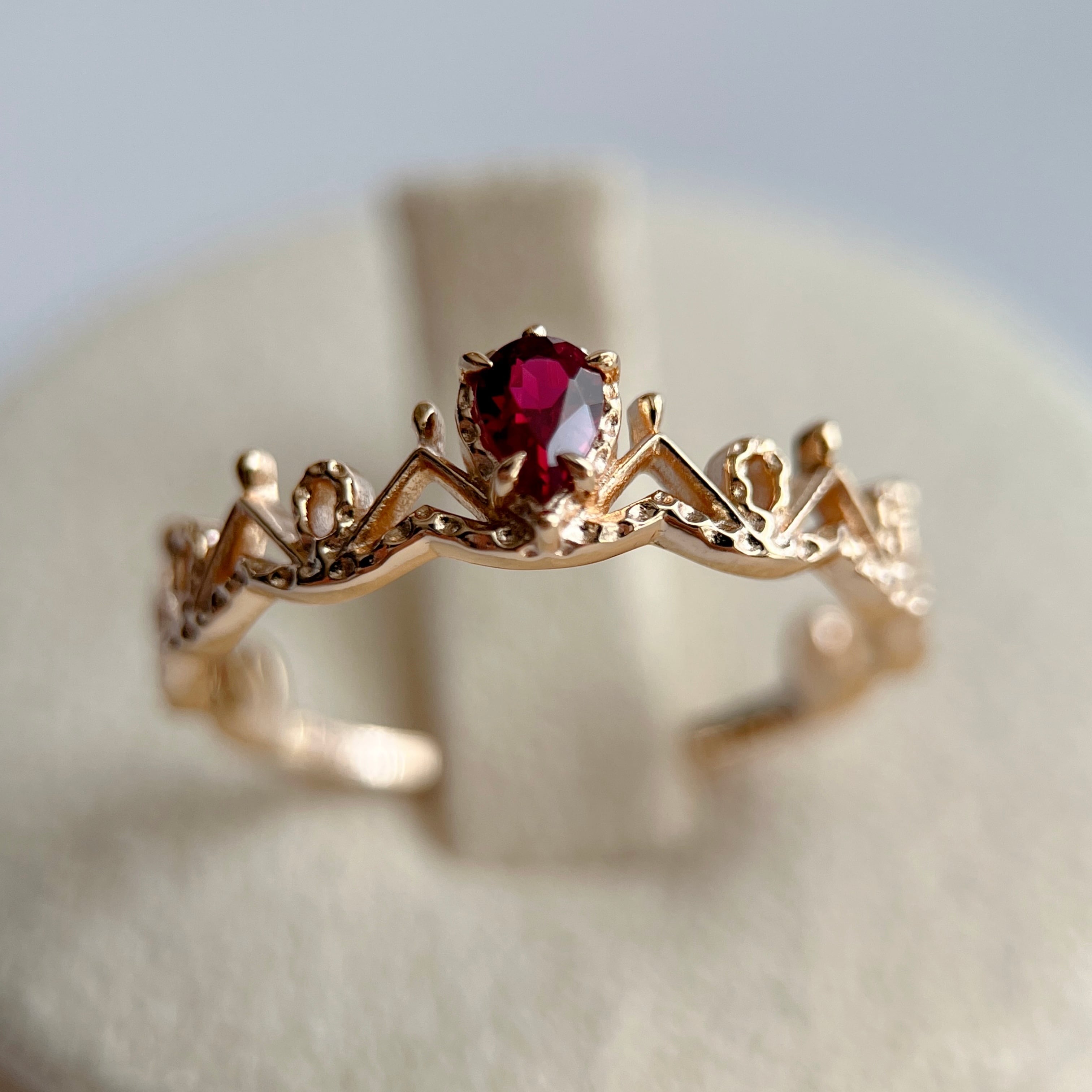 ドロップ型にカットされたラボグロウンルビーの一粒石リングです。