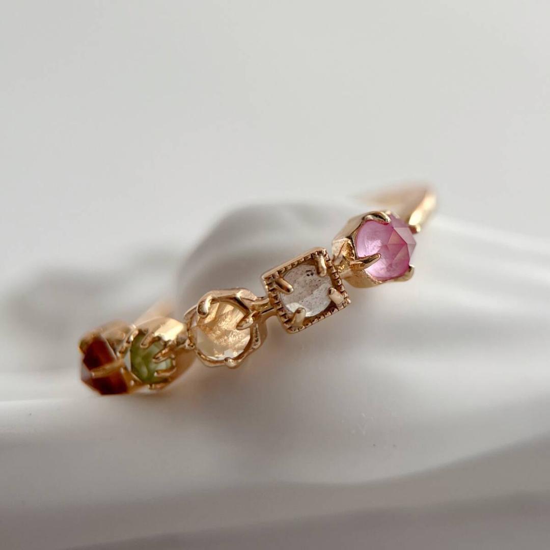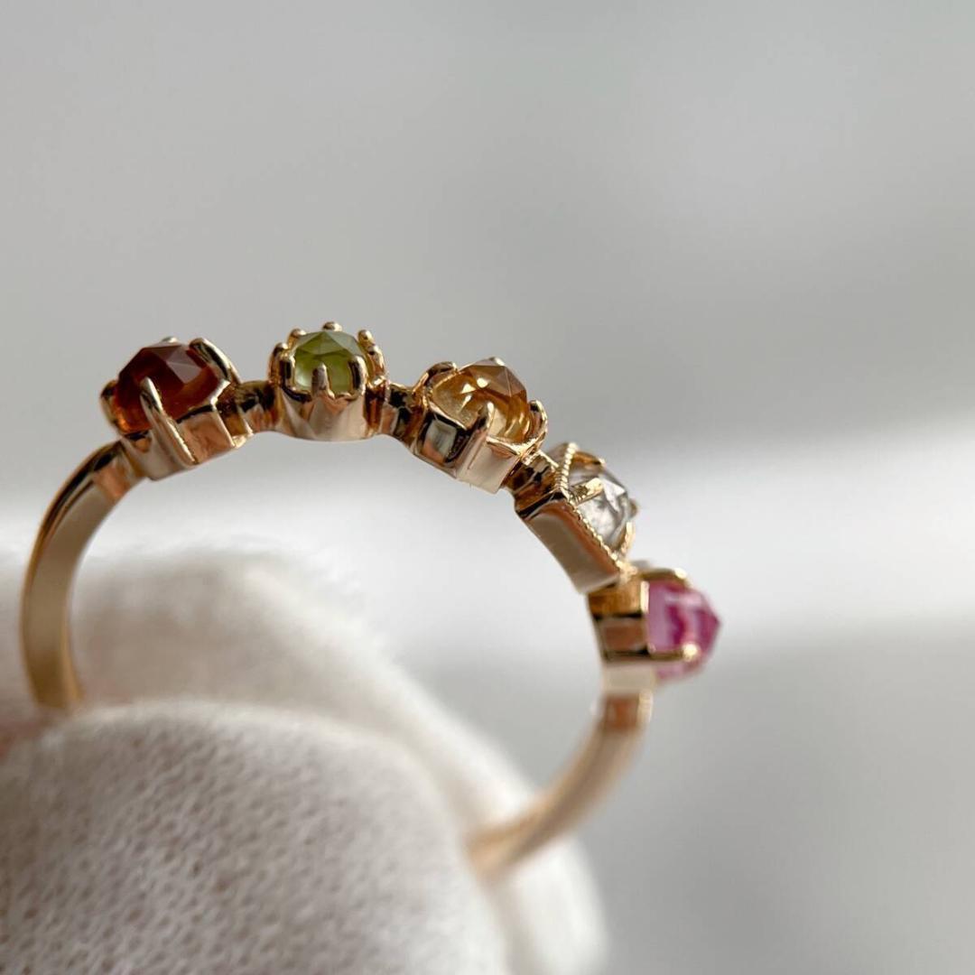色とりどりの天然石をあしらったリング。