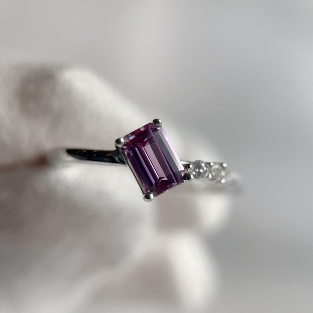 合成アレキサンドライトを使った、モダンなデザインのリングです。